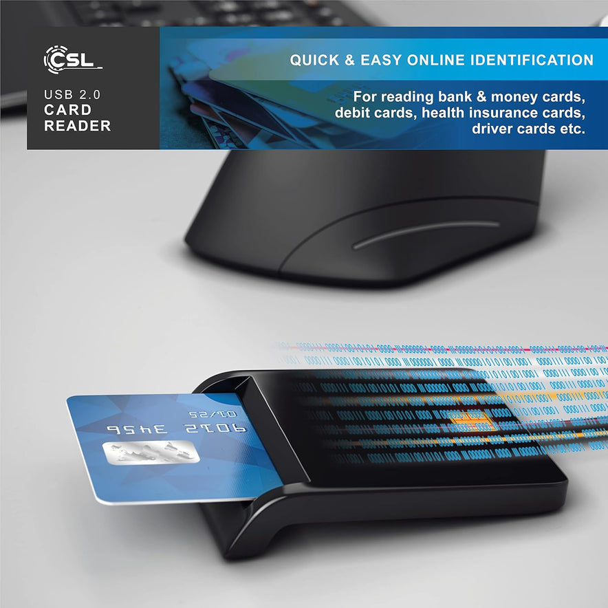 The CSL USB Smart Card Reader is perfect for online identification for online services such as e-banking or for tax return. Bank and cash cards, giro cards, health and insurance cards or even driver cards etc. can be read quickly and easily with the chip memory card reader.