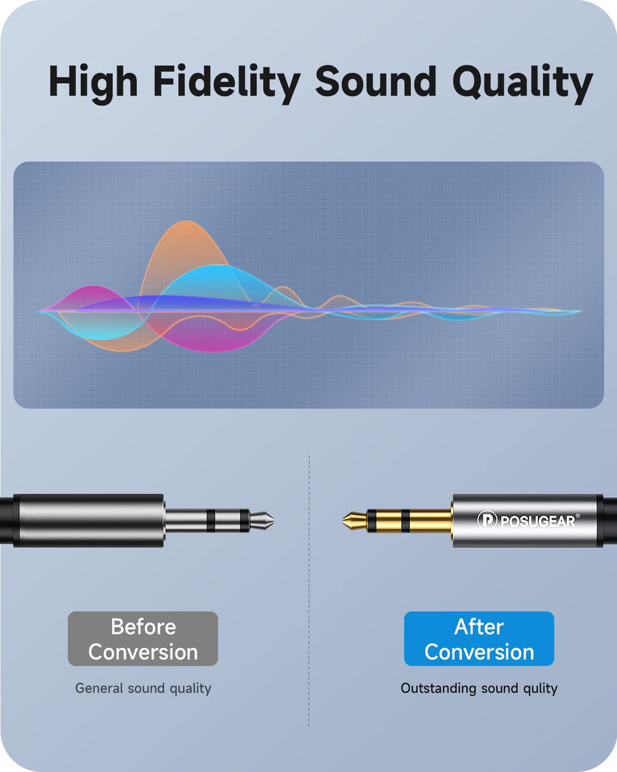 - Box contents: POSUGEAR 3.5 mm stereo jack plug to 6.35 mm jack plug 0.5 m x 1