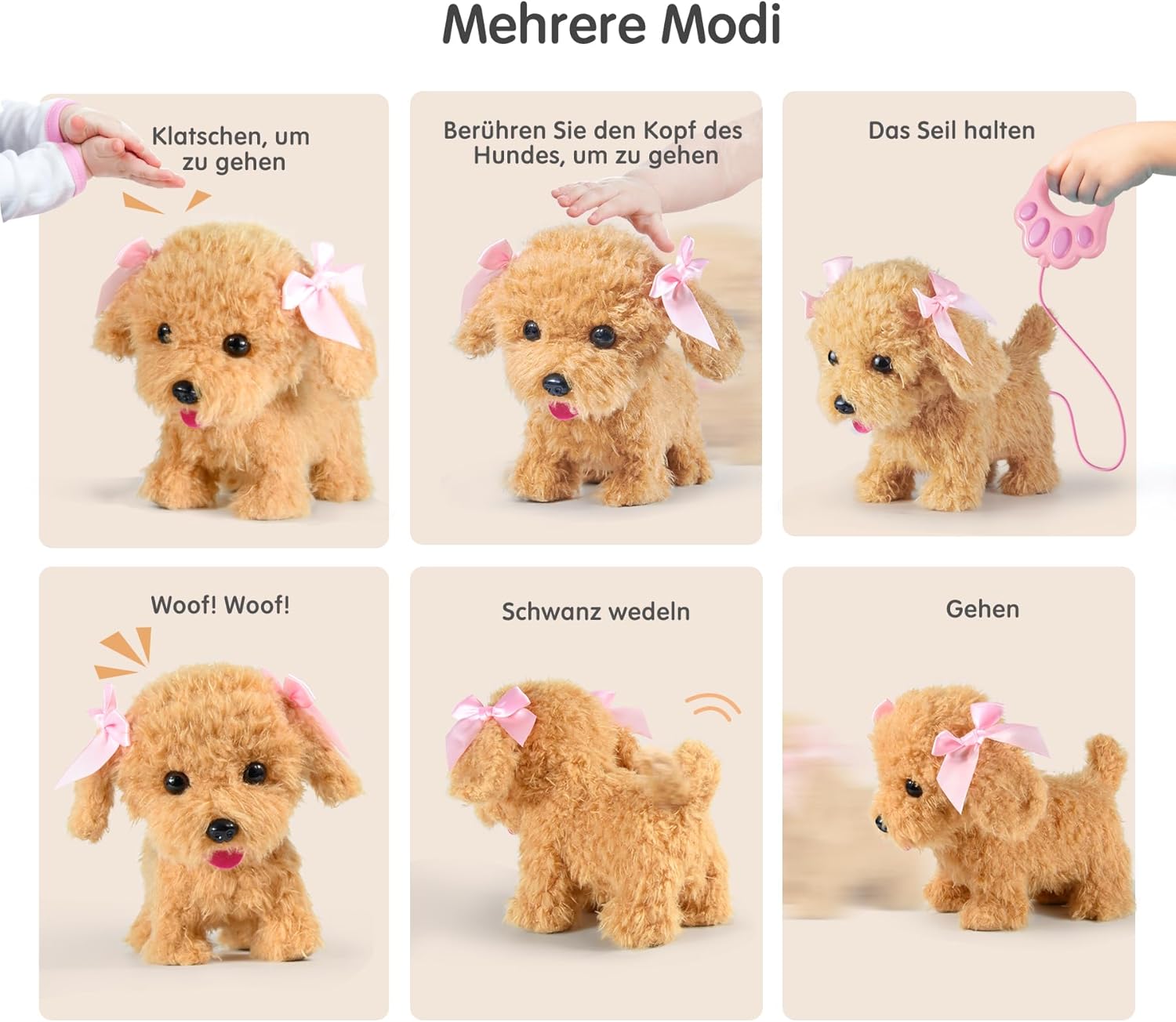 - Interactive functional dog with sound and running function, as a real dog would. When you insert the batteries and turn on, press the button on the handle of the leash, it is fun to bring the dog to life. It goes, wags its tail, head and barks. This is a perfect gift for any younger child, it will have hours of interactive fun with this super cute toy