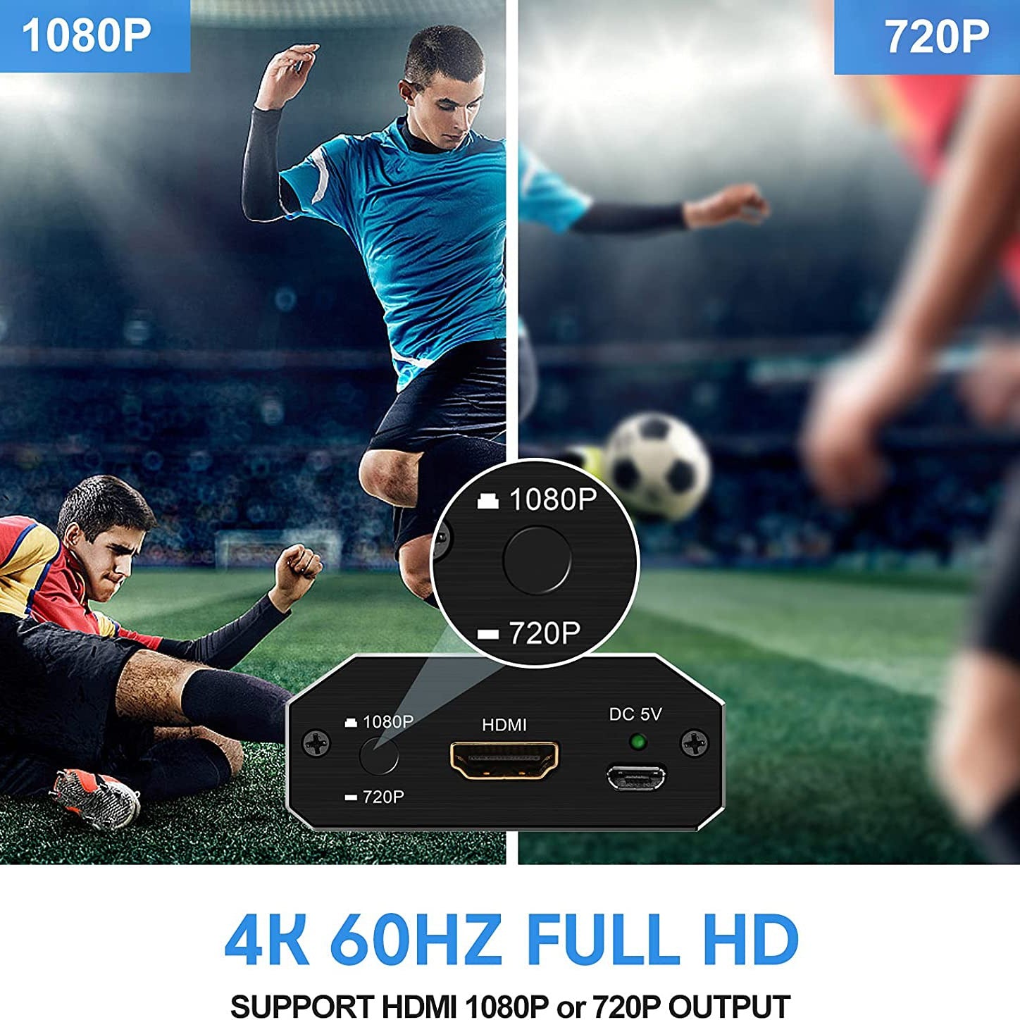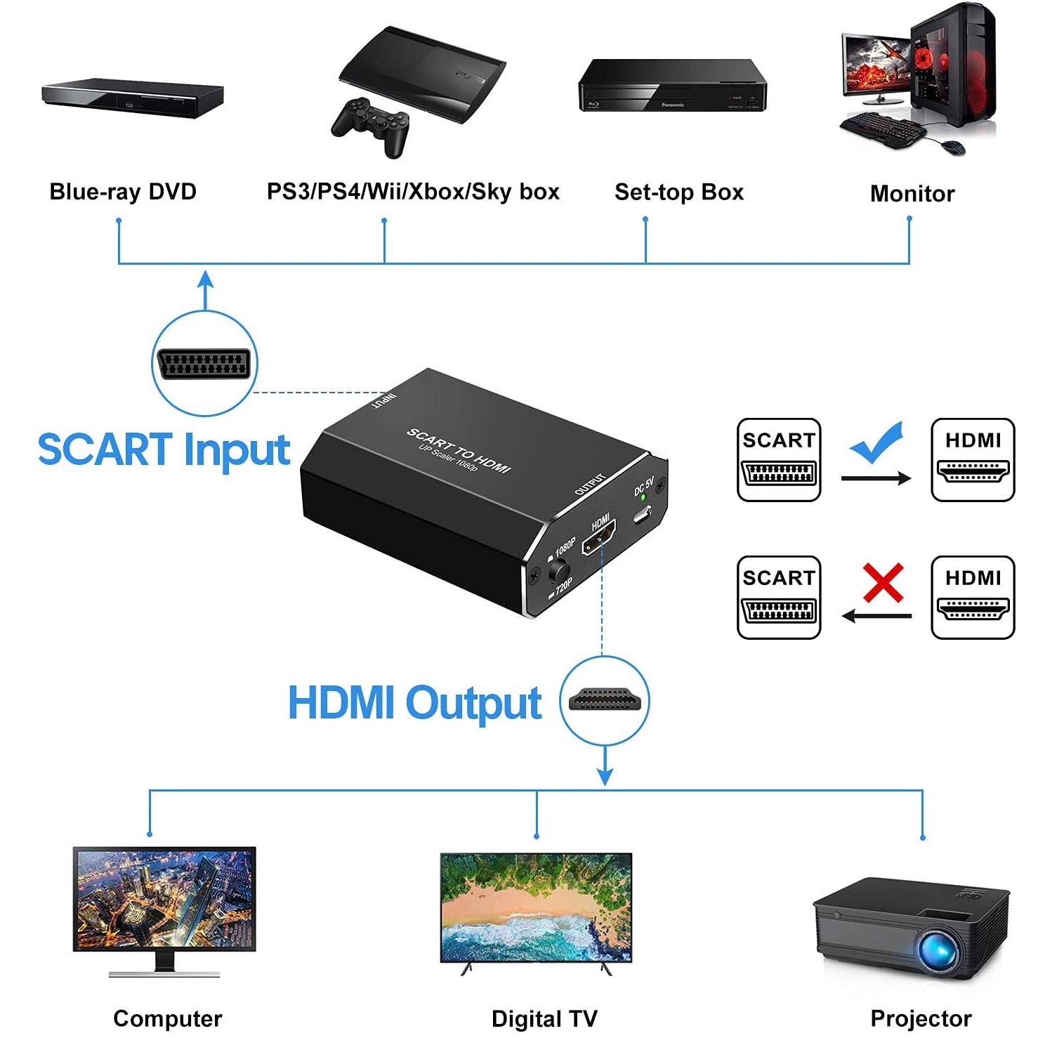 - 【SCART to HDMI Converter】SCART to HDMI Converter convert analogue SCART input to an HDMI 720P / 1080p (60Hz) output. Supports convert to full HD 1080P by switch button, delivering the sharpest, most realistic HD visuals available, making video come alive. (NOTE: This is a SCART to HDMI Converter, it CANNOT be used as an HDMI to SCART converter.)