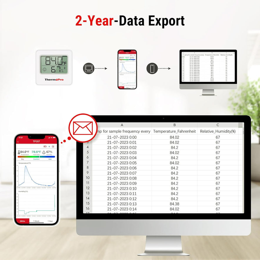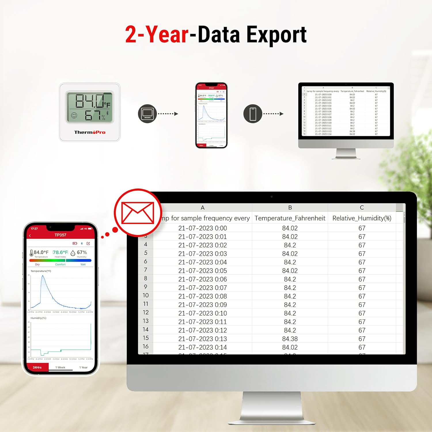The ThermoPro TP357 offers precision, convenience, and peace of mind in a sleek and versatile design. Monitor multiple environments effortlessly, receive alerts directly to your phone, and ensure optimal comfort or storage conditions for your home, baby, pets, plants, or valuables. Perfect for anyone who values accuracy, smart technology, and easy monitoring.