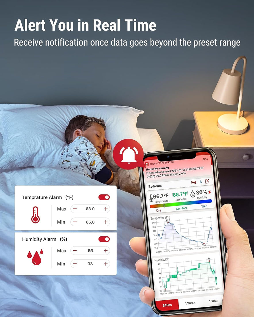 Preset Temperature & Humidity Alerts: Receive instant notifications when readings fall outside your selected ranges.