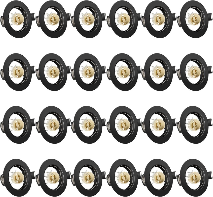 Package Includes: 24x round mounting frame + 24x GU10 socket functions: Easy bulb replacement without disassembling the entire frame. The spot angle is fixed and cannot be adjusted, so the illumination angle of the light will not change due to the influence of external factors. Installation depth: approx. 75 mm, cut-out diameter: approx. 65 mm. Suitable for all lamps with a diameter of 50mm. These round matte black metal frames are ideal for living room, bedroom, kitchen, bathroom, hallway, hotel, office, library, KTV, basement, department store and more.