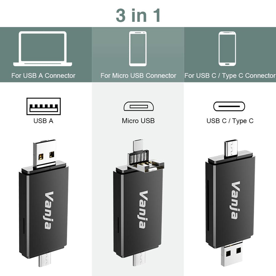 - [Multi-Function Design] - Vanja USB 2.0 Card Reader set the USB 2.0 plug, Micro USB plug and USB C plug in one, making this card reader compatible with all USB C device and tablets and Android smart phones that support OTG function.